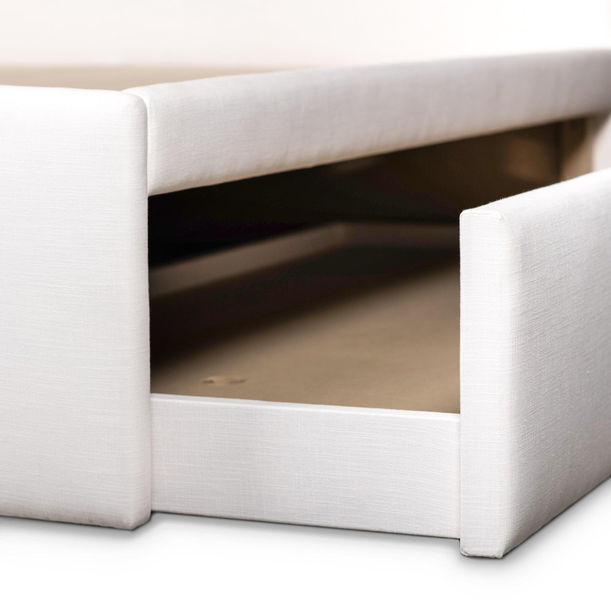Custom made pull-out bed with headboard attached to bed base fully upholstered in standard range Fiberguard fabric. Top mattress excluded, lower pull-out drawer mattress included.