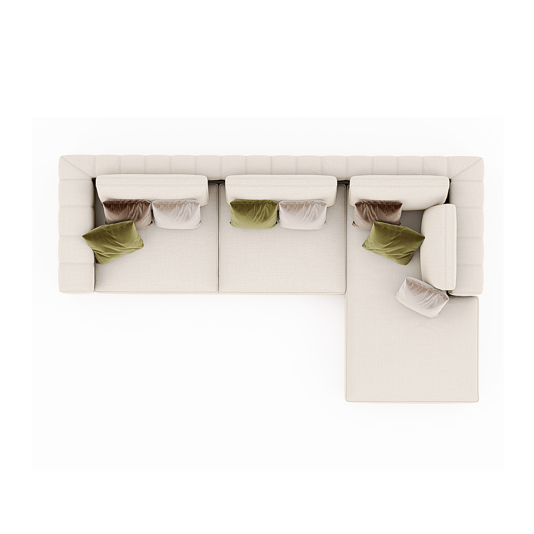 Tailor made L-shape sofa with cushions with removable covers. Sofa is fully upholstered in Fibreguard Proposition 16-Antique fabric and the cushions are upholstered in 13-Sensous, 13-Fern, 17- Earth and 33-Veluxe Tiramisu. Cushions are not included in price.