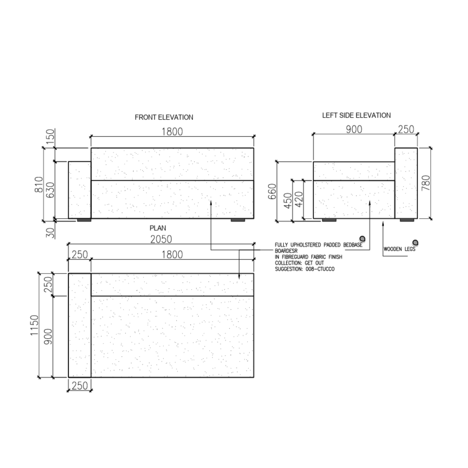 Custom-made outdoor sofa with wooden legs and one-side armrest fully upholstered in Get Out 008-Stucco FibreGuard fabric.