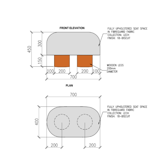 Custom-made bench with wooden legs fully upholstered in Fibreguard Poker Falcon-2 fabric.