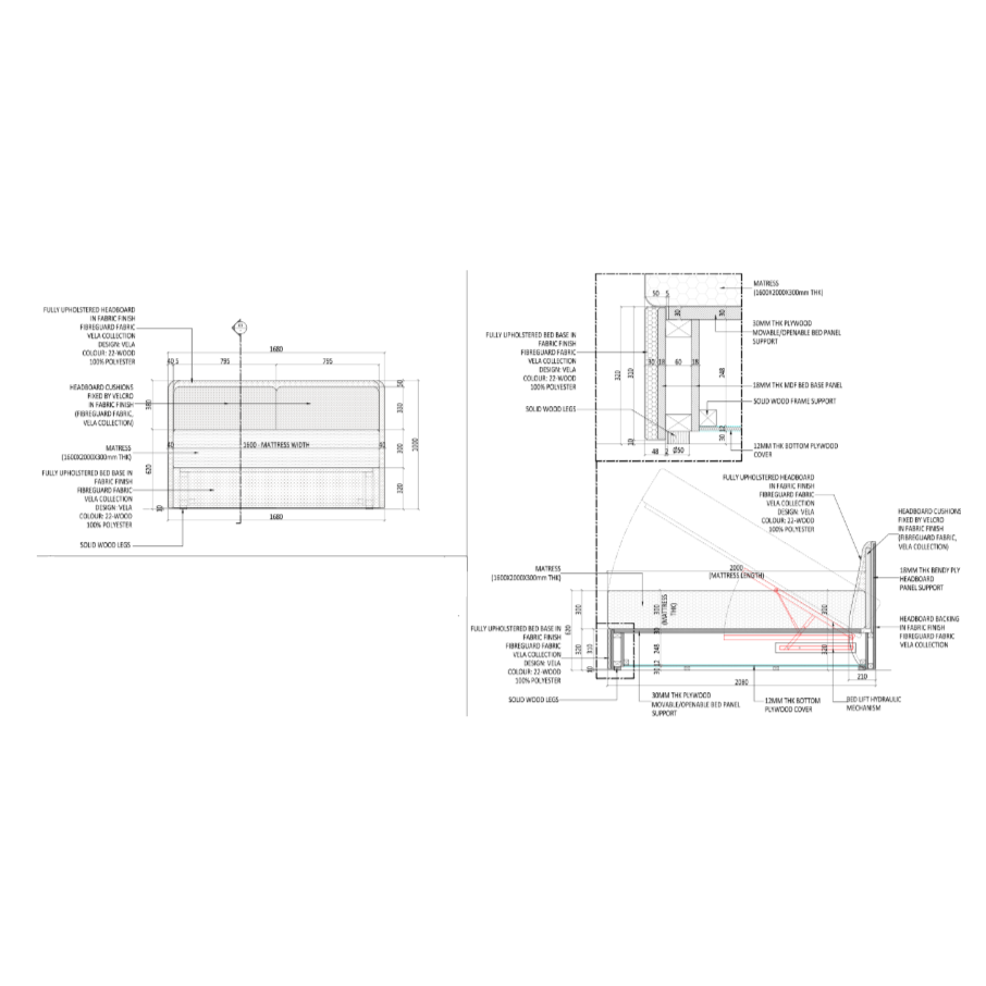 Custom-made hydraulic bed with headboard attached to bed base fully upholstered in Fibreguard fabric. Top mattress excluded.