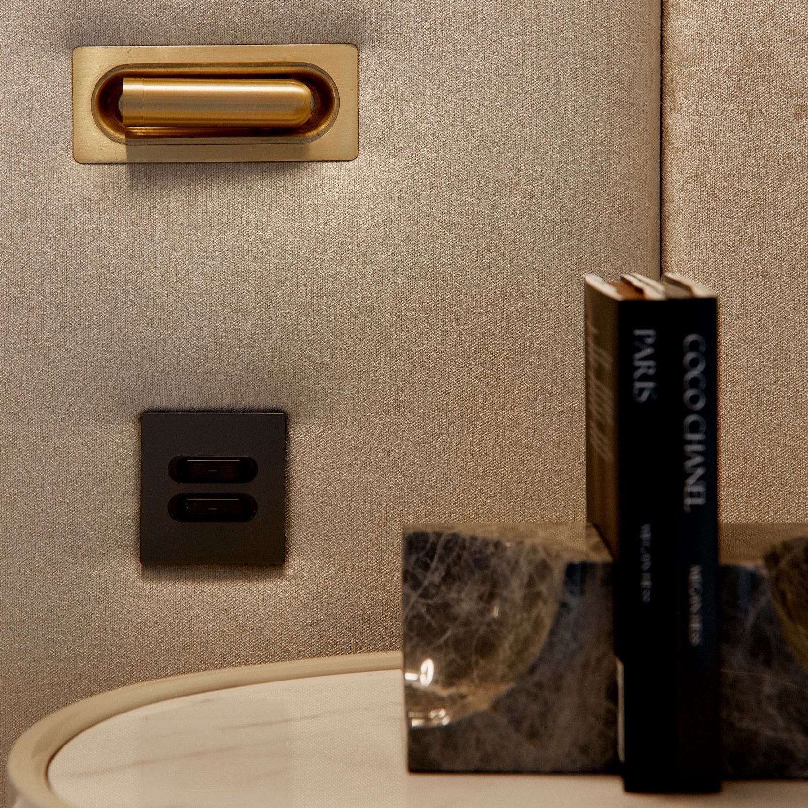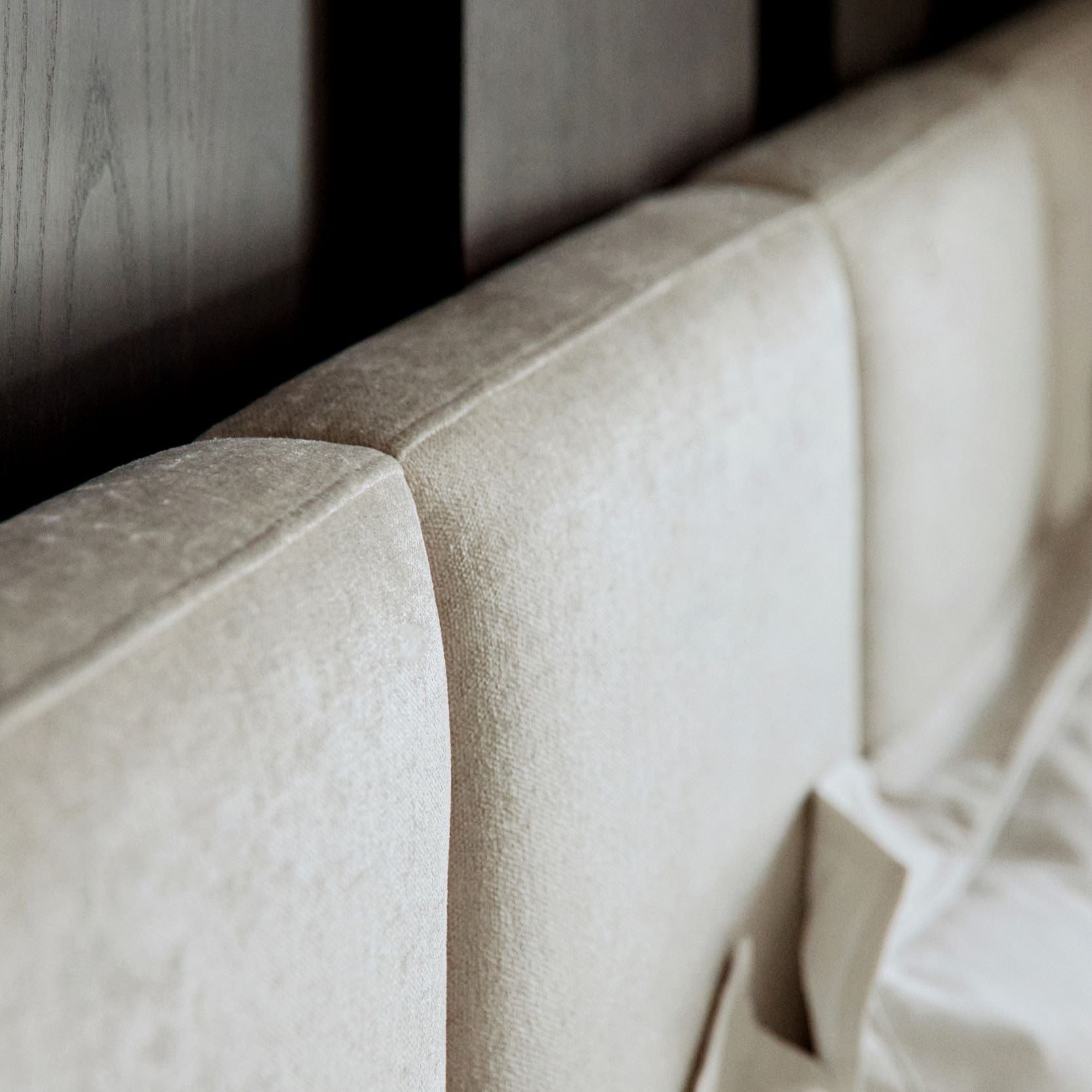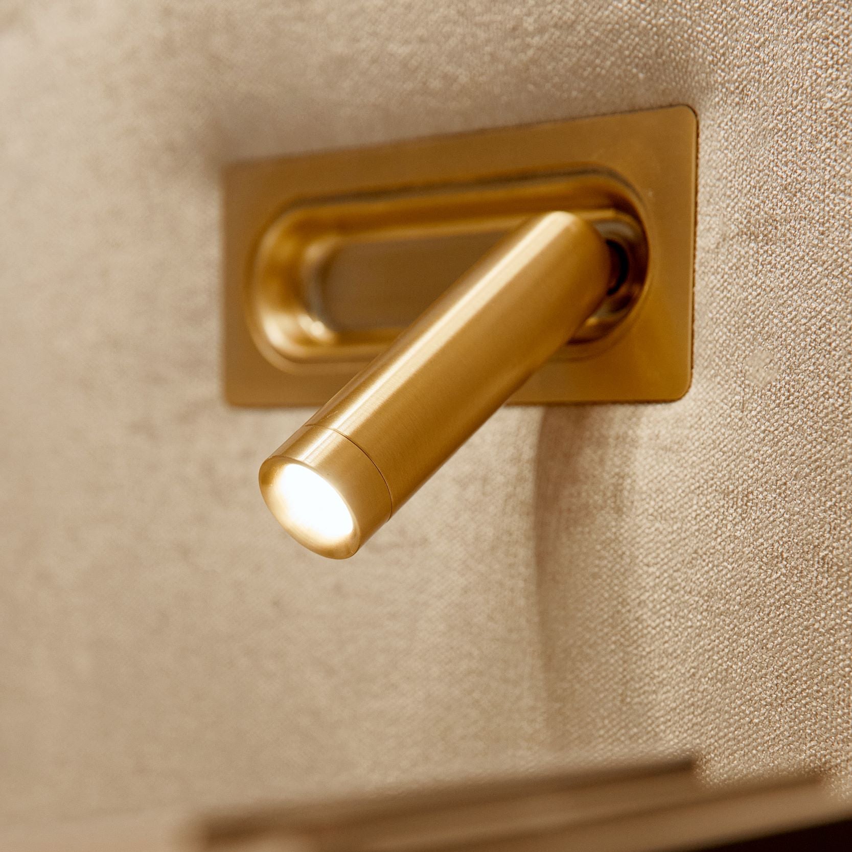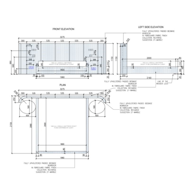 Custom-made bed with built-in lights and sockets fully upholstered in Recharge 27-Marble Fibreguard fabric.