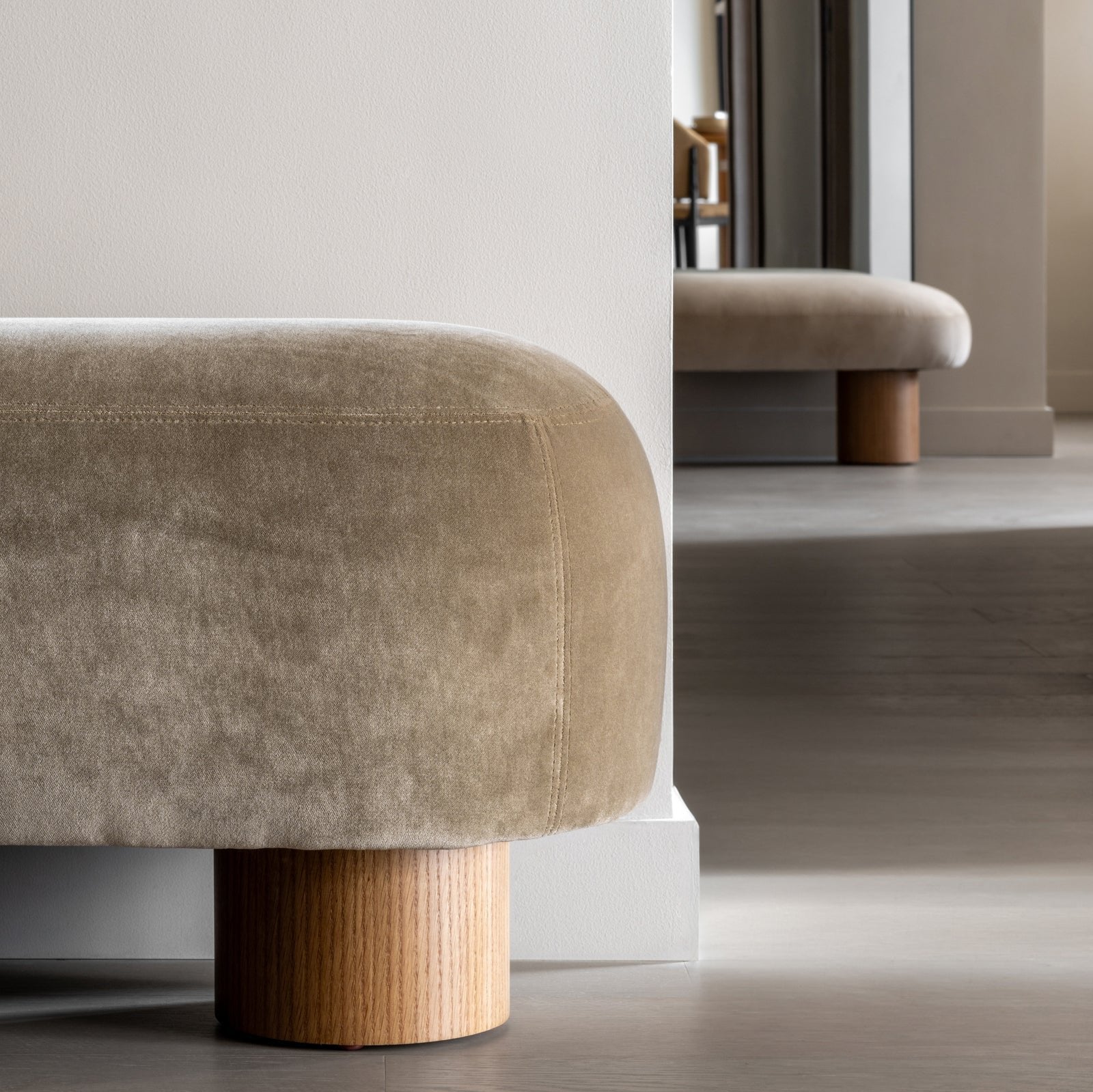 Custom-made bench with wooden legs fully upholstered in Fibreguard Lech 18-Biscuit fabric.