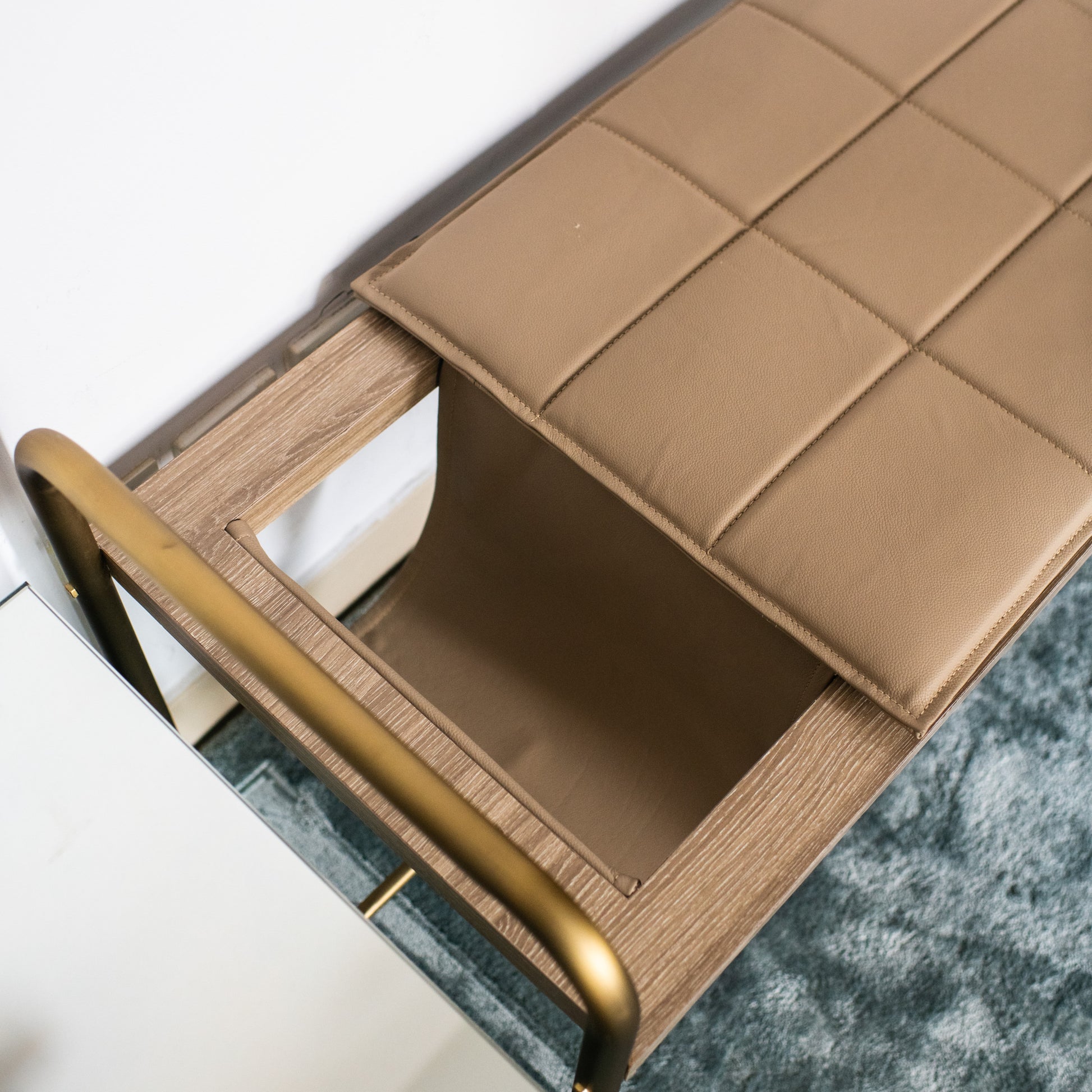 Tailor-made bench with genuine leather seat and magazines pocket with metal electroplated base and laminated MDF seat.